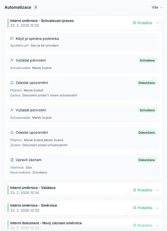 Na detailu záznamu se zobrazuje seznam všech automatizací, které během existence tohoto záznamu:
