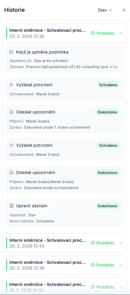 jaké kroky automatizace provedla (např. „nastavit hodnotu pole“, „poslat notifikaci“, „vyžádat schválení"…),