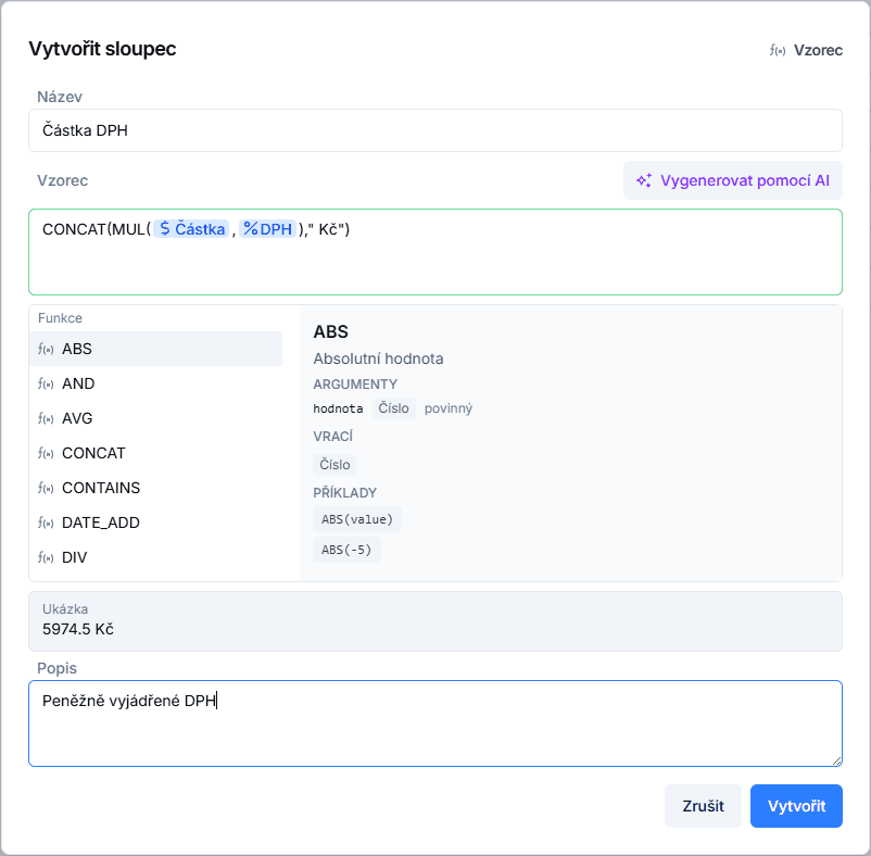 Výpočtový sloupec je speciální typ sloupce, jehož hodnota se automaticky počítá na základě jiných sloupců v tabulce. Hodnota se nedá ručně přepisovat ani vytěžovat z dokumentu – vždy vychází z definované formule.